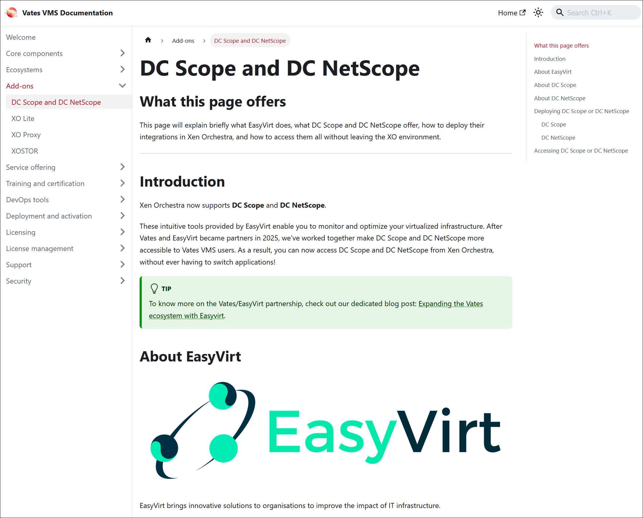 We’ve expanded the Vates VMS documentation with a dedicated page on integrating EasyVirt’s DC Scope and DC NetScope solutions with Xen Orchestra.